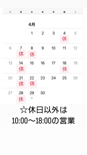☆4月27日(日) 10:00〜16:00の営業 ☆4月28日(月) 定休日 ☆4月29日(火) 10:00〜18:00の営業 ☆4月30日(水) 10:00〜18:00の営業