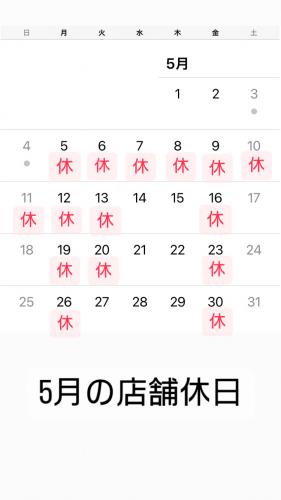 【5月の店舗休日】 5日・6日・7日・8日・9日・10・11日・12日・13日・16日・19日・20日・23日・26日・30日